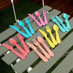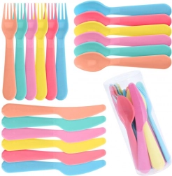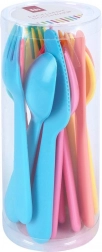 Kleurrijke set kunststof bestek voor 6 personen bevat 6× mes, 6× vork en 6× lepel. Licht, meermalig te gebruiken, met afgeronde, veilige randen en comfortabele grip. Ideaal voor picknicks, tuinfeesten en reizen. Geleverd in een praktische box voor eenvoudig opbergen.