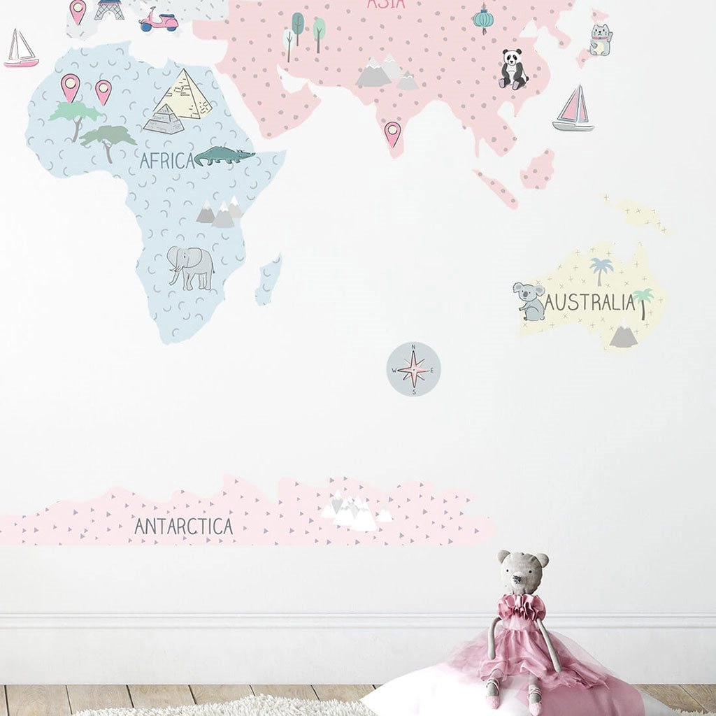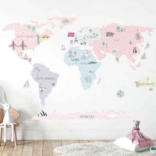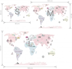 Ontdek de magie van spelenderwijs leren met de prachtige wereldkaart L in roze pasteltinten als muursticker. Deze decoratie in Scandinavische stijl brengt elke kinderkamer tot leven, voegt educatieve elementen toe (continenten, oceanen, windstreken, bezienswaardigheden) en is dankzij de matte laminaatlaag krasbestendig en gemakkelijk aan te brengen. Elk element is apart uitgesneden voor eenvoudige applicatie, ook in grotere ruimtes.
