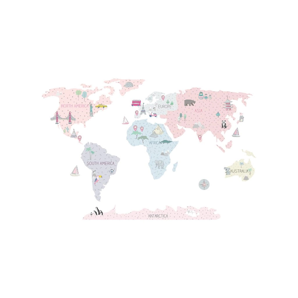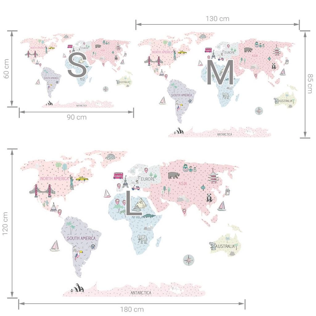 De roze wereldkaart in maat L is een elegante en tegelijk praktische wanddecoratie voor de kinderkamer. Gedempte pasteltinten passen perfect in moderne interieurs en zorgen voor een prettige sfeer om te spelen en te leren. Kinderen maken op een natuurlijke manier kennis met continenten, oceanen, windstreken en bekende bezienswaardigheden.