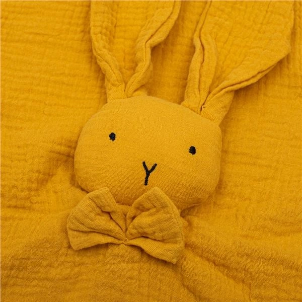 Zacht mousseline knuffeldoekje New Baby Rabbit in mosterdgele kleur is het ideale eerste tutdoekje voor een baby. Gemaakt van 100% biologische katoen met een zachte vulling en helpt een gevoel van veiligheid en rustig in slaap vallen te bevorderen. Het minimalistische design en de zachte kleuren passen perfect in elke uitzet en combineren mooi met andere mousseline producten.