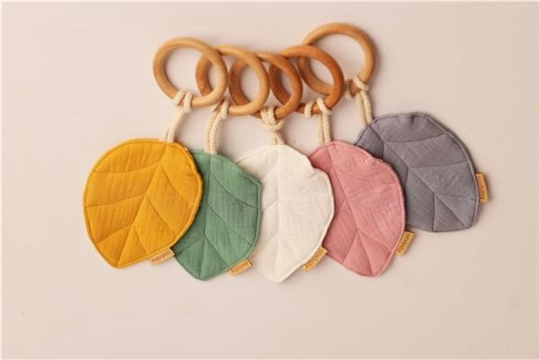 De praktische en stijlvolle New Baby Leaf-bijtring in grijs biedt baby’s directe verlichting bij doorkomende tandjes. De combinatie van natuurlijk beukenhout en zachte mousselinestof is vriendelijk voor het tandvlees en veilig voor dagelijks gebruik. De bijtring kan ook worden gebruikt als sensorisch speelgoed voor baby’s en past perfect bij andere mousselineproducten van het merk.