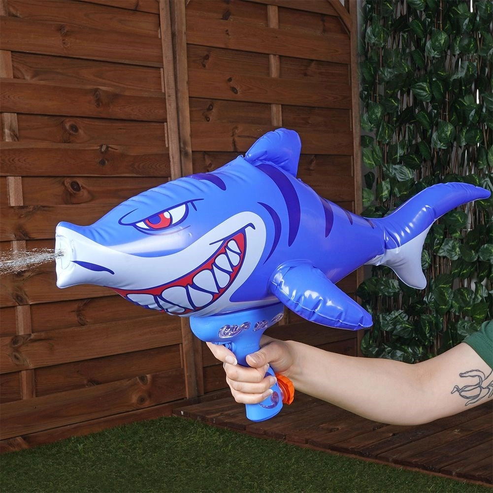 Geniet van de zomer met dit opblaasbare waterpistool in haai-vorm, dat heerlijk veel plezier biedt bij het water en in de tuin. In de verpakking zit ook een handpomp voor snel oppompen. Het pistool heeft een grote watertank, is duurzaam en eenvoudig te gebruiken – vul met water en druk op de trekker; het water spuit uit het haaienbekje.