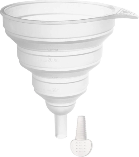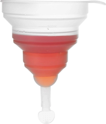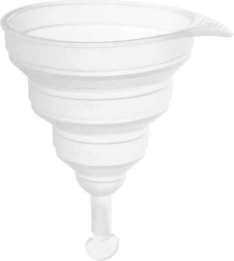 De opvouwbare trechter is een onmisbare hulp in elke keuken. Dankzij de siliconen uitvoering is hij compact op te bergen, stabiel en bij juist gebruik gaat hij vele jaren mee. De geïntegreerde maatschaal 50–300 ml maakt nauwkeurig afmeten van zowel vloeistoffen als droge ingrediënten eenvoudig.
