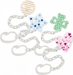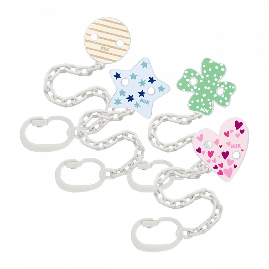De NUK fopspeenketting met clip is ontworpen om de speen altijd binnen handbereik en schoon te houden. De praktische clip wordt eenvoudig aan babykleding bevestigd en blijft stevig zitten, zodat de speen niet kwijt raakt, ook niet tijdens wandelingen en reizen. Heldere kleuren en vrolijke motieven stimuleren het zicht en spreken zelfs de allerkleinste baby’s aan.