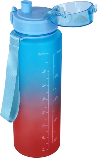 Praktische sportfles van 1 l met een ombre-ontwerp in blauw en rood houdt je de hele dag gehydrateerd. Hij heeft tijdsaanduidingen en motiverende teksten, een meetschaal in ml en fl oz, een lekvrij flipdeksel met vergrendeling en een comfortabele drinktuit die met één hand te bedienen is. Licht, duurzaam en met een polslus voor gemakkelijk dragen tijdens sport, werk en uitstapjes.