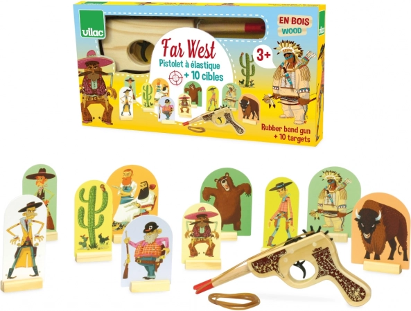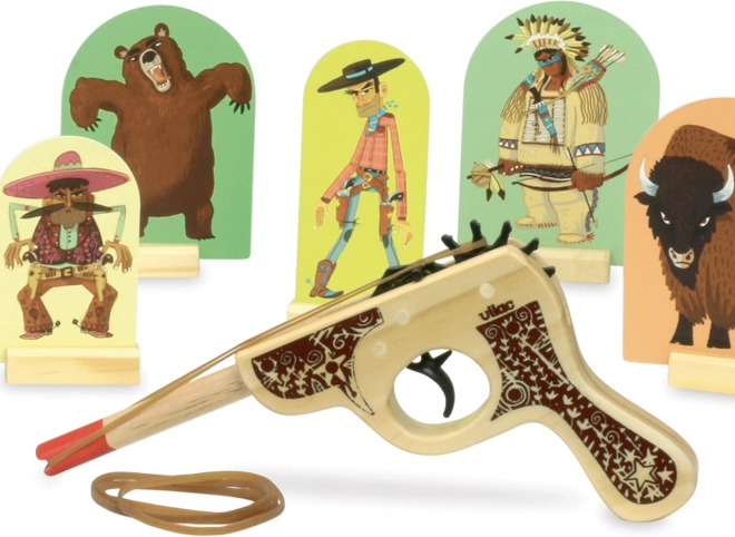 Beleef de sfeer van het Wilde Westen met dit houten pistool met doelen van VILAC. Het spel is ideaal voor kinderen vanaf 3 jaar en helpt nauwkeurigheid te trainen, concentratie en fijne motoriek. Gewoon het elastiek spannen, de doelen neerzetten en beginnen met schieten – plezier voor het hele gezin.