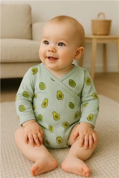 Ontdek het comfort van mousseline in de babyromper NEW BABY AVOCADO. De lichte en luchtige stof is ideaal voor dagelijks gebruik en voor de gevoelige huid van pasgeborenen. De schattige all-over avocado print geeft de babygarderobe een speelse touch.