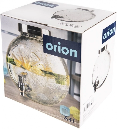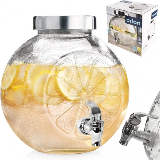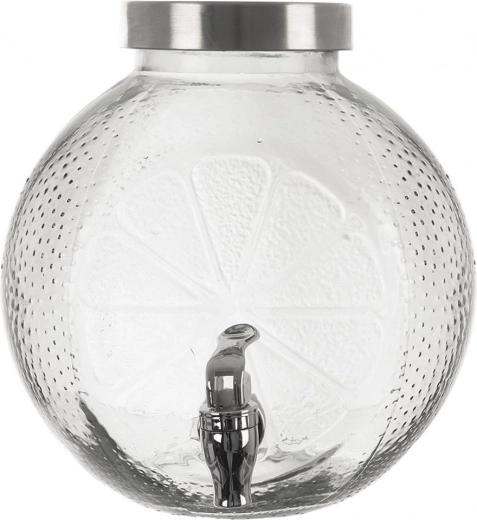 Stijlvolle glazen drankdispenser met een inhoud van 5,4 l, metalen deksel en een praktisch kraantje. Ideaal voor limonades, sappen en huisgemaakte ijsthee. Stevig helder glas met decoratief citrusreliëf, een brede opening voor eenvoudig vullen en een deksel tegen insecten maken het de perfecte keuze voor tuinfeesten en serveren thuis.