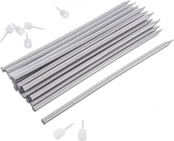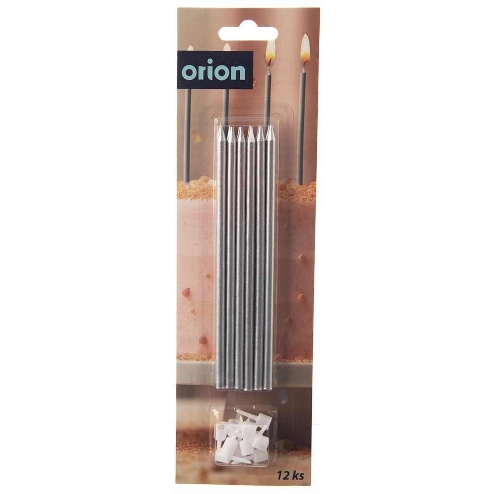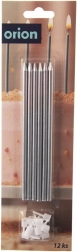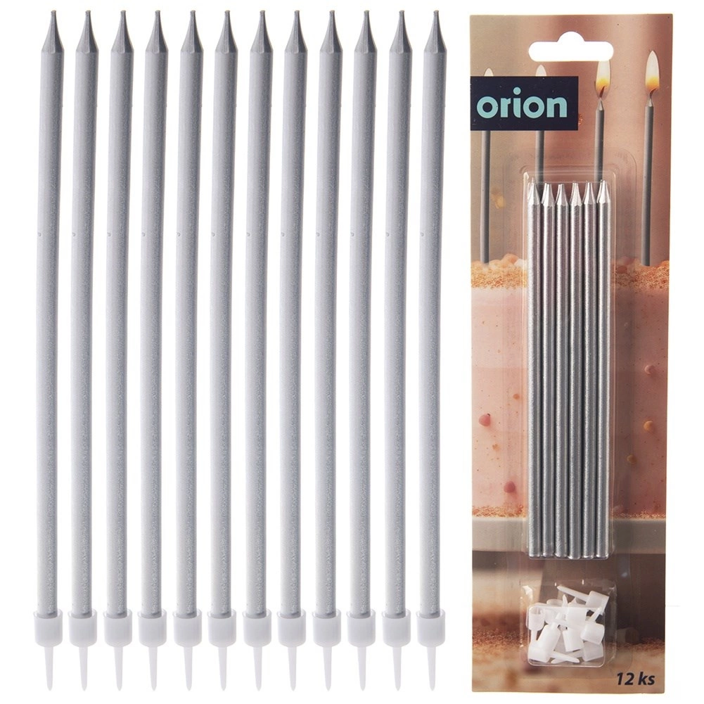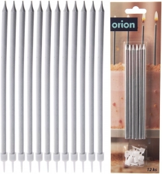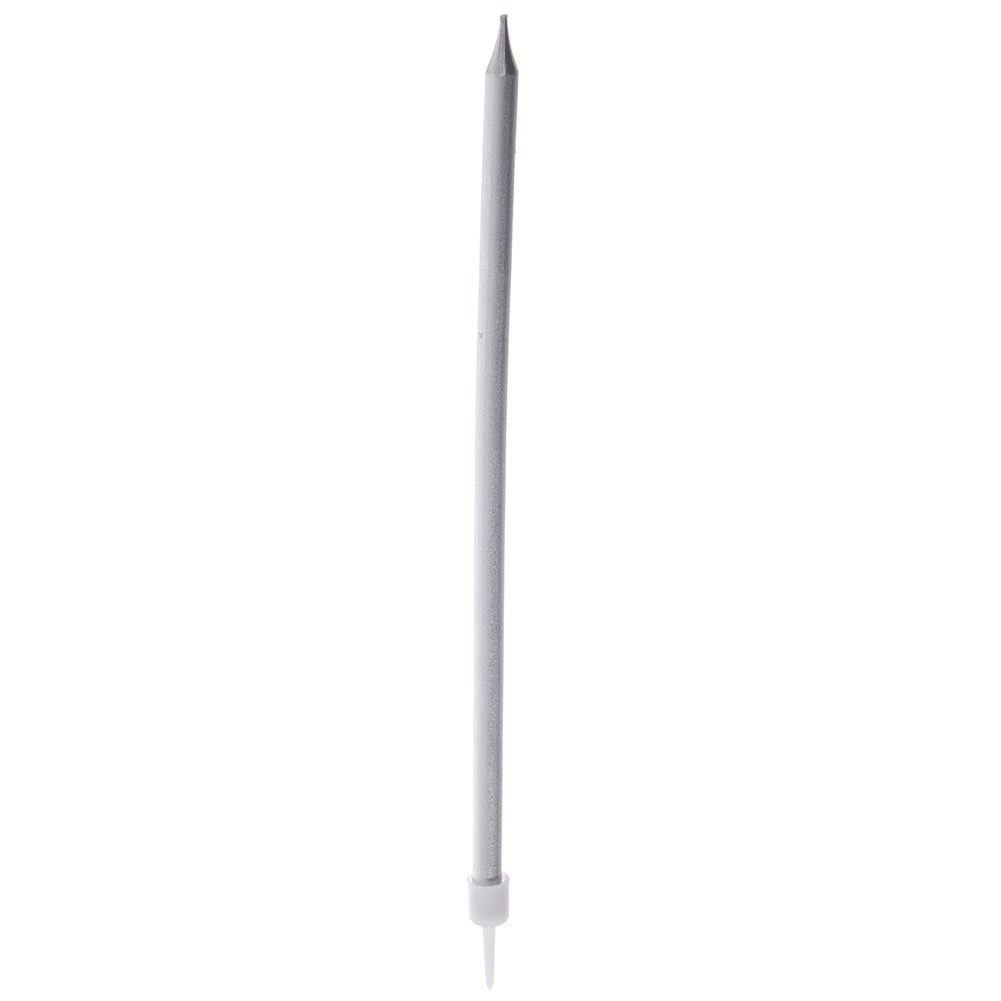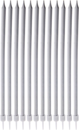 Elegante set van 12 lange taartkaarsen in metallic zilverkleur met een hoogte van 14,5 cm voor feestelijke taarten en desserts. Inclusief witte kunststof houders voor stabiele bevestiging. Het frisse design en de opvallende hoogte geven elke viering een bijzondere uitstraling. De universele zilveren kleur past bij elke taart.