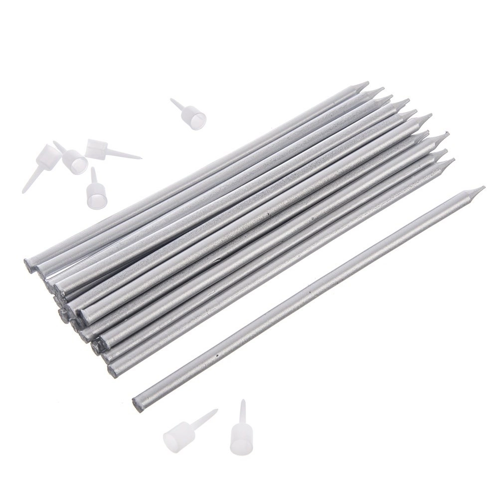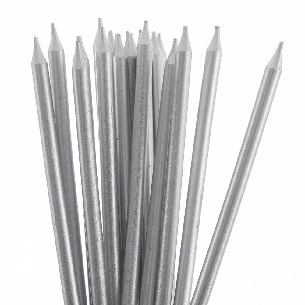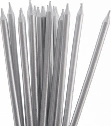 Creëer een onvergetelijk moment bij het uitblazen van wensen met deze set lange zilveren kaarsen. Dankzij de hoogte van 14,5 cm komen ze ook op grotere taarten mooi tot hun recht zonder de decoraties te bedekken. Praktische witte voetjes zorgen voor een veilige en stevige plaatsing van de kaarsen in de taartbodem.