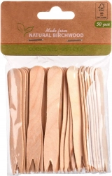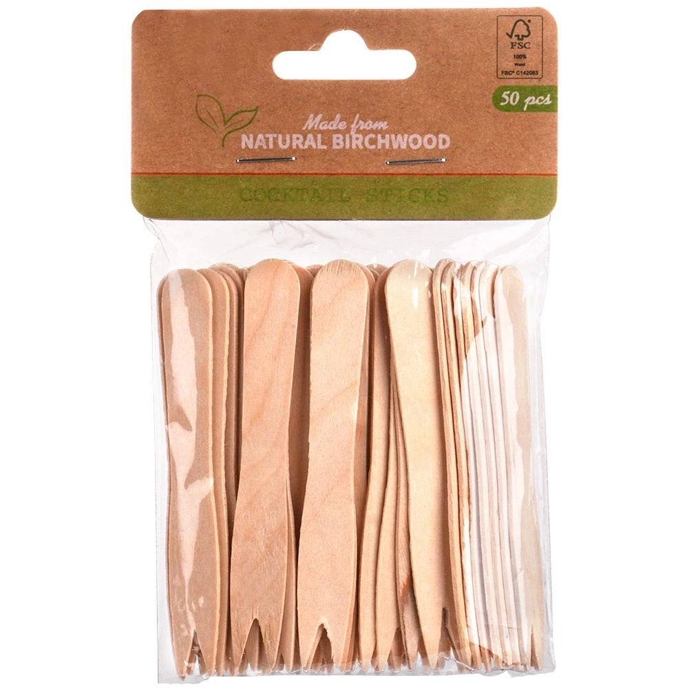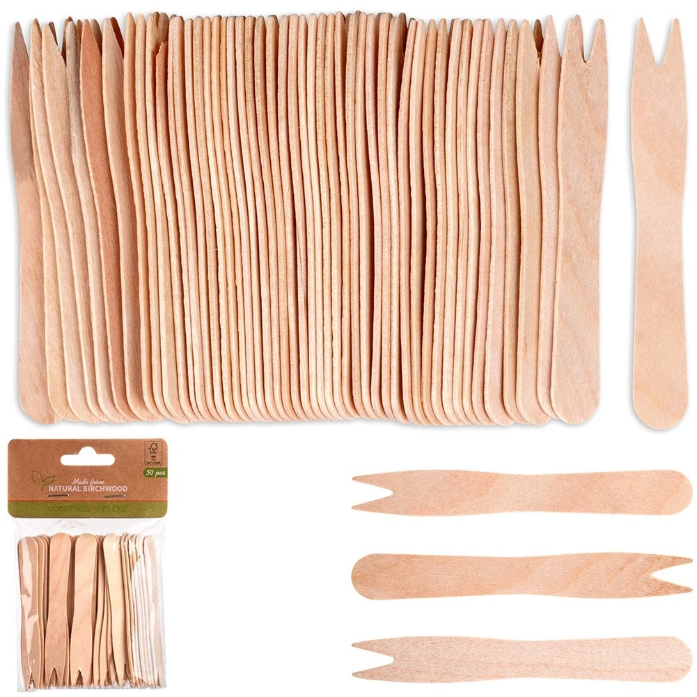 Praktische wegwerp houten vorkjes van 8,5 cm in een verpakking van 50 stuks voor eenvoudig serveren en eten van snacks. Gemaakt van natuurlijk berkenhout, ze zijn sterk, licht en breukbestendig. Ideaal voor friet, fruit, kaas, groenten of mini-sandwiches. Milieuvriendelijk en biologisch afbreekbaar, een uitstekend alternatief voor plastic.
