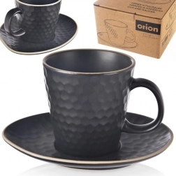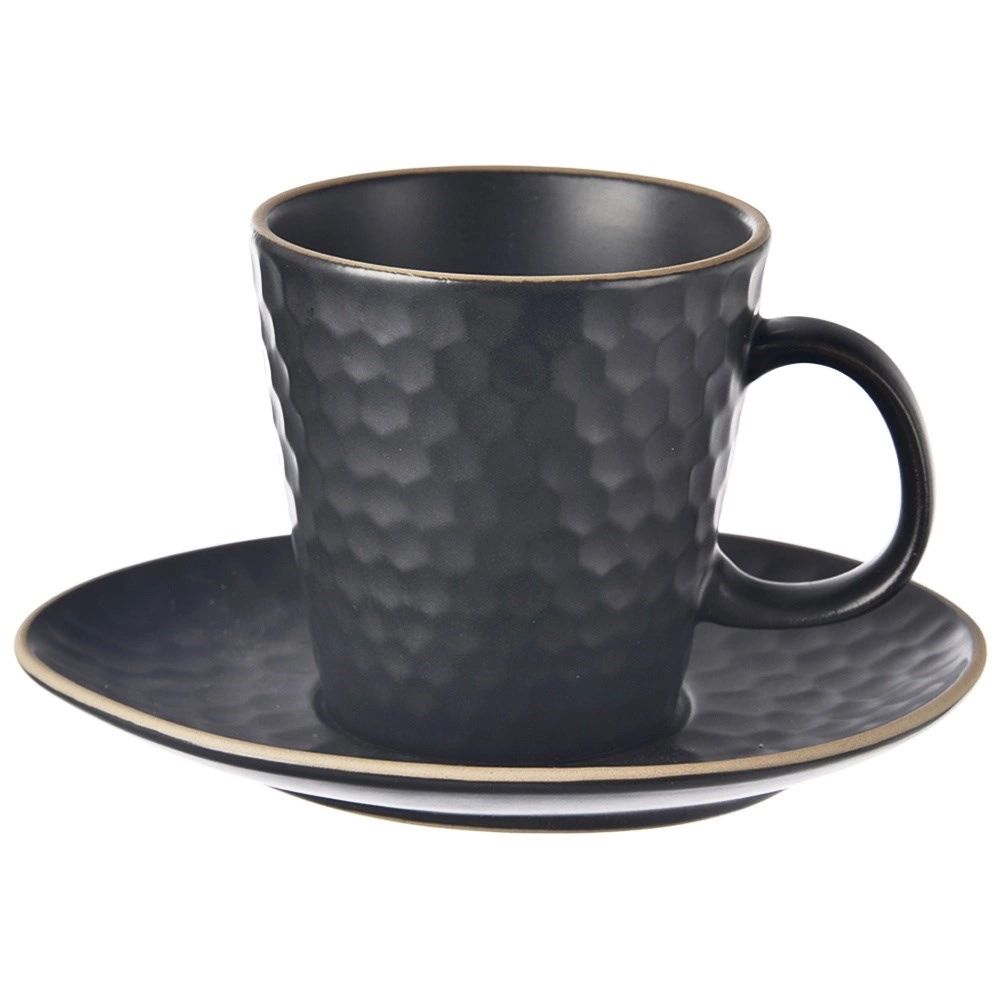 Geniet van je favoriete koffie of thee in de elegante TEA TIME-kop. Mat zwart steengoed met een subtiele contrasterende rand en een gestructureerd oppervlak met honingraatpatroon geven de kop en schotel een modern en tijdloos uiterlijk. Dankzij het comfortabele oor ligt de kop goed in de hand en de schotel vangt eventuele druppels op.