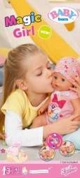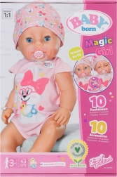 Pop BABY BORN meisje 43 cm met een magische speen biedt realistische functies zonder batterijen – ze drinkt, eet pap, plast in de luier en op het potje, huilt echte tranen en dankzij de speen gaan haar ogen open en dicht in elke positie. Zacht lijfje Soft Touch, soepel beweegbare ledematen en 10 accessoires voor eindeloos speelplezier en het stimuleren van de fantasie.