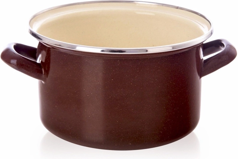 Stijlvolle geëmailleerde pan met een inhoud van 2 l en een diameter van 18 cm, ideaal voor het koken en stoven van alledaagse gerechten. Gemaakt van staal met een hoogwaardige, gezondheidsvriendelijke emaillaag, geschikt voor alle soorten kookplaten, inclusief inductie, en voor gebruik in de oven. Voorzien van comfortabele, robuuste handgrepen, eenvoudig te reinigen en vaatwasmachinebestendig. De elegante bruine buitenkant en crèmekleurige binnen-emaillering worden aangevuld met een roestvrijstalen rand voor extra duurzaamheid.