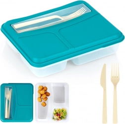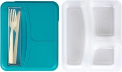 Deze compacte lunchbox met indeling in 3 delen houdt hoofdgerecht, salade en snack overzichtelijk gescheiden. Het turkooiskleurige deksel bevat praktisch bestek – een mes en een vork – zodat je alles bij de hand hebt, waar je ook bent. BPA-vrij en veilig voor jou en je eten.