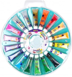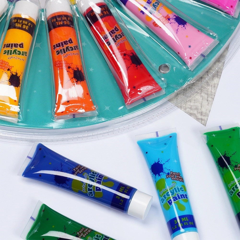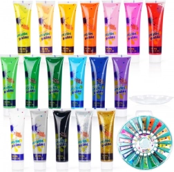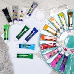Ontdek een veelzijdige set acrylverf voor creatieve projecten: 18 kleuren in praktische tubes van 36 ml en een kunststof palet om tinten te mengen. De verven hebben intense en duurzame pigmenten, uitstekende dekking en zijn geschikt voor papier, canvas, hout en textiel. Inclusief metallic, parelmoer, neon en glitter varianten voor opvallende effecten.