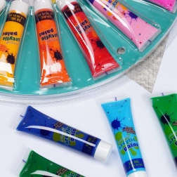 - Basiskleuren + goud met glitters, zilver met glitters, neon, parelmoer