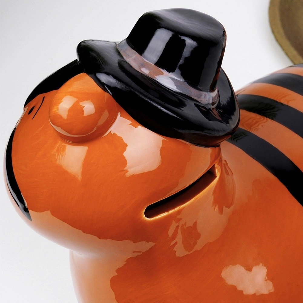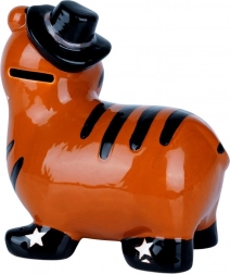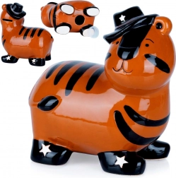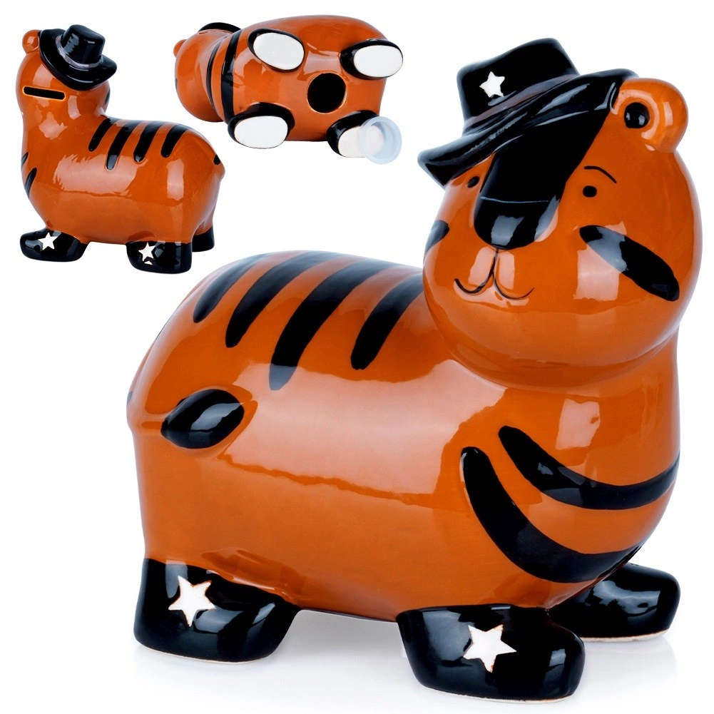 Schattige keramische spaarpot in de vorm van een tijger met glanzend glazuur en een stijlvolle hoed, ideaal voor kinderen én volwassenen. Heeft een praktische opening aan de onderkant met een stop voor het gemakkelijk verwijderen van spaargeld en wordt een vrolijke interieurdecoratie. Duurzame keramiek, levendige kleuren en veilig opbergen van munten en bankbiljetten maken van deze spaarpot een ideaal cadeau voor elke gelegenheid.