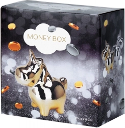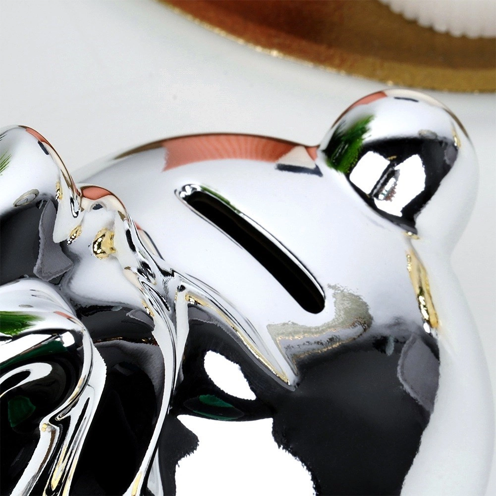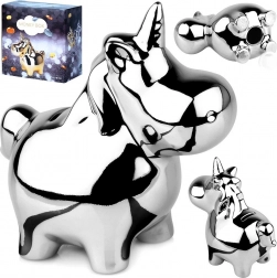 Deze keramische eenhoorn-spaarpot valt op door het spiegelende zilveren oppervlak dat je huis een vleugje glamour geeft. Met afmetingen van 18 × 10,5 × 18 cm biedt hij voldoende ruimte voor kleingeld en gevouwen bankbiljetten, terwijl hij stabiel staat op een plank, dressoir of bureau.