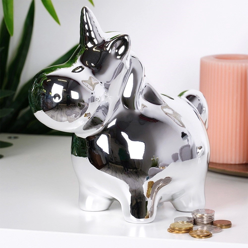 De hoogglanzende, chroomachtige afwerking verandert de spaarpot in een opvallende decoratie die schittert op een plank of bureau.