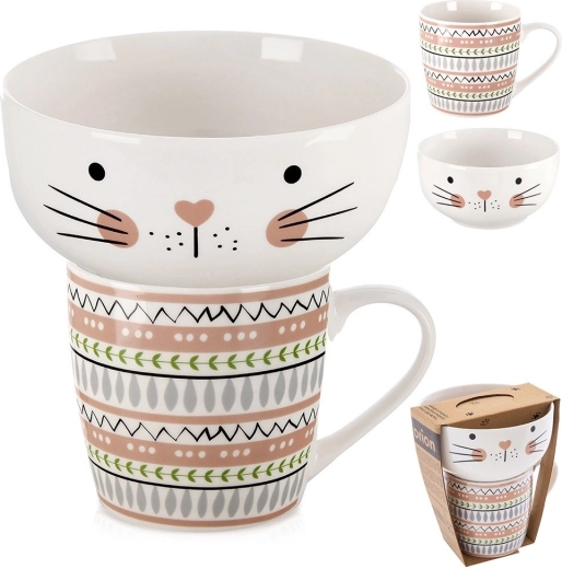 Geniet van stijlvol serveren bij het ontbijt. Deze porseleinen set met een schattig kattengezicht combineert mok en kom tot een speels geheel – leuk voor kinderen en volwassenen. Hoogwaardig porselein met een gladde, glanzende glazuur voelt prettig aan, is duurzaam voor dagelijks gebruik en gemakkelijk schoon te houden.