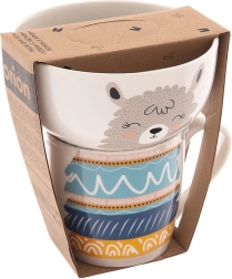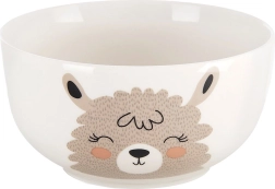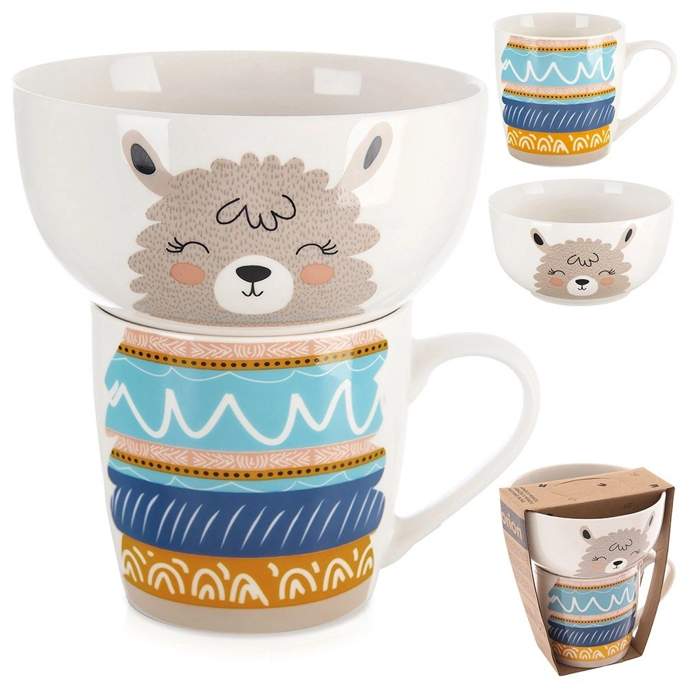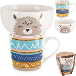 Stijlvolle en functionele set voor kleine eters en liefhebbers van schattige motieven. Witte hoogwaardige porseleinen glazuur met een subtiele lama-opdruk maakt elke maaltijd knusser en stimuleert eetplezier. Mok en kom zijn prettig gevormd voor comfortabel vasthouden en dagelijks gebruik.