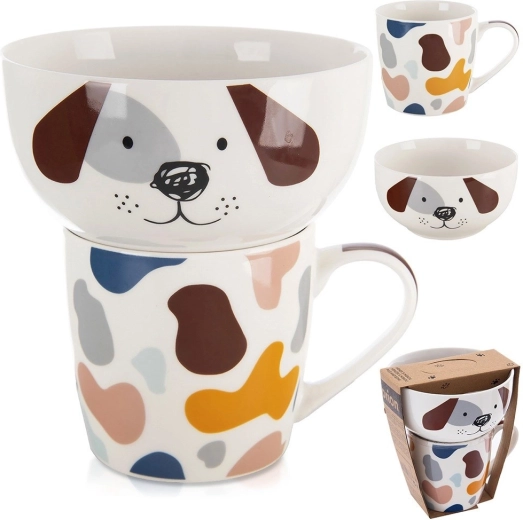 De kom en mok kunnen op elkaar worden gezet en vormen samen een vrolijk hondjesmotief. Geweldig voor zowel ontbijtgranen als drankjes waar kinderen van genieten.