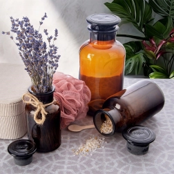 Stijlvolle bruine glazen pot met een inhoud van 250 ml, een brede hals en een goed sluitende stop, ideaal voor dagelijks gebruik. Biedt bescherming tegen licht, universele toepasbaarheid en gemakkelijk vullen zonder morsen. Perfect voor oliën, tincturen, specerijen, gedroogde kruiden en badzout en tegelijk een decoratief element in het interieur.