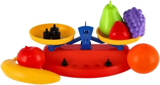 De set bevat 7 realistisch gevormde stukken fruit van licht en duurzaam plastic en een praktische weegschaal met twee schalen. Ideaal voor kleuters vanaf 3 jaar – veilige materialen, opvallende kleuren en eenvoudige bediening nodigen uit tot herhaald spelen.