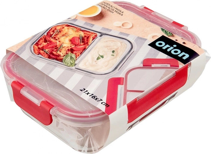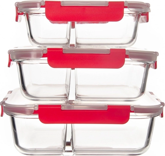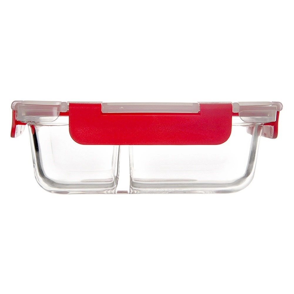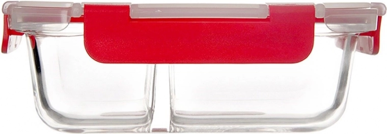Gemaakt van borosilicaatglas dat bestand is tegen temperaturen van -20 °C tot 300 °C. Het deksel met een rode siliconen afdichting en vier snap-lock clips zorgt voor een lekvrije sluiting en langere versheid. De afdichting tussen de vakken voorkomt ongewenst overlopen.