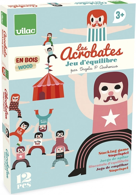 Een leuke set van twaalf houten acrobaten van het merk VILAC brengt een slimme balansspel voor het hele gezin. Kinderen én volwassenen zullen met plezier de figuurtjes op elkaar stapelen en verschillende formaties uitproberen. Het spel ontwikkelt geduld, logisch denken, fijne motoriek en creativiteit. De originele look is gegarandeerd door illustraties van Ingela P. Arrhenius.