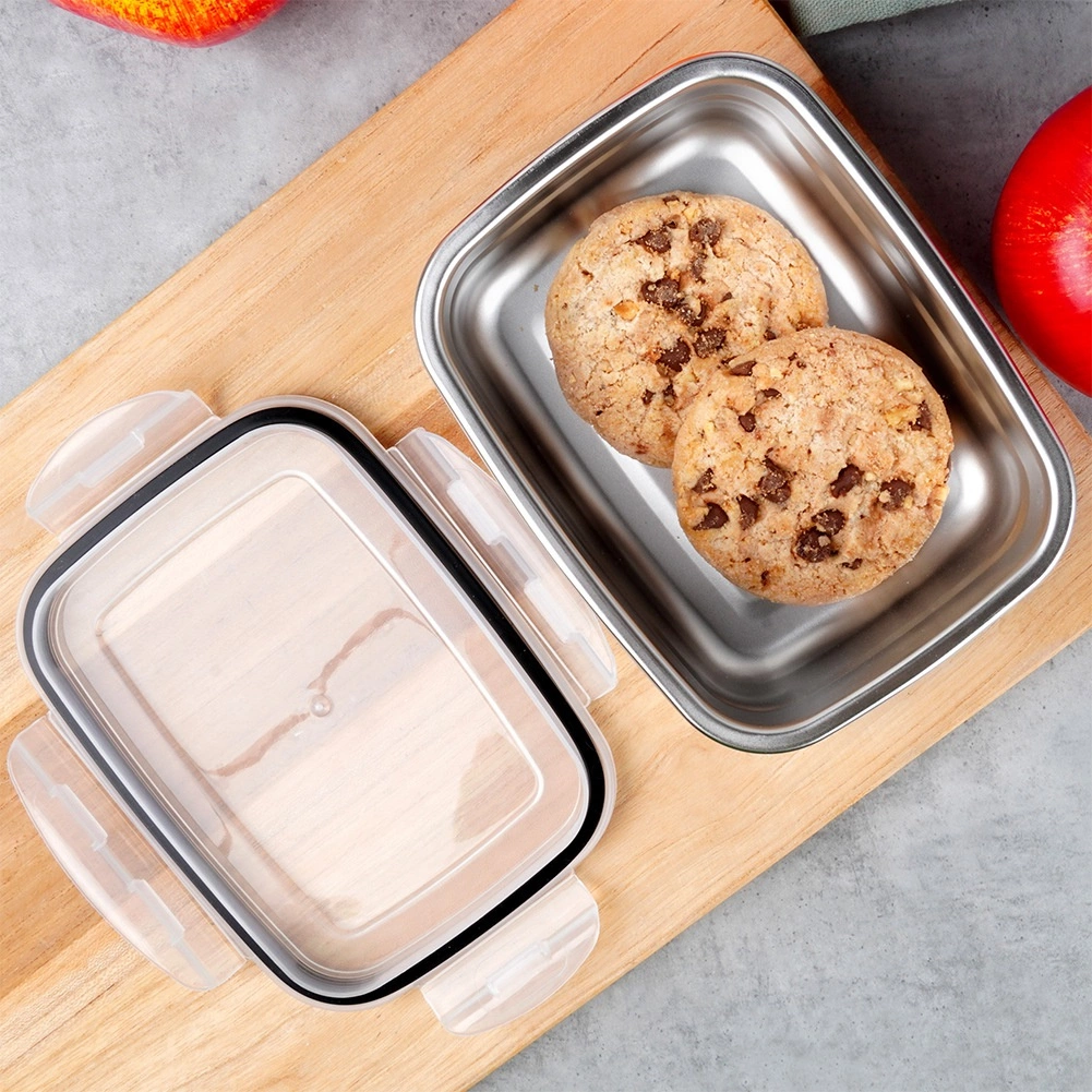 Compacte RVS voedselcontainer van 500 ml met transparant deksel, vier clips en siliconenafdichting voor een perfect luchtdichte en lekkagevrije afsluiting. Ideaal voor lunch, tussendoortjes en restjes – thuis, op het werk en onderweg. Duurzaam roestvrij staal houdt de temperatuur beter vast en het deksel maakt snelle inhoudscontrole mogelijk.