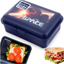 Stijlvolle en duurzame lunchbox met een opvallend ruimtemotief en de tekst SPACE, aantrekkelijk voor zowel kinderen als volwassenen. Eenvoudige enkelvoudige kamer en rechthoekige vorm bieden voldoende ruimte voor sandwiches, fruit of andere lekkernijen. De box is licht, gemaakt van voedselveilige materialen die neutraal zijn voor smaak en geur, en voldoet aan de Europese normen.