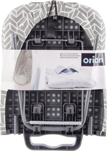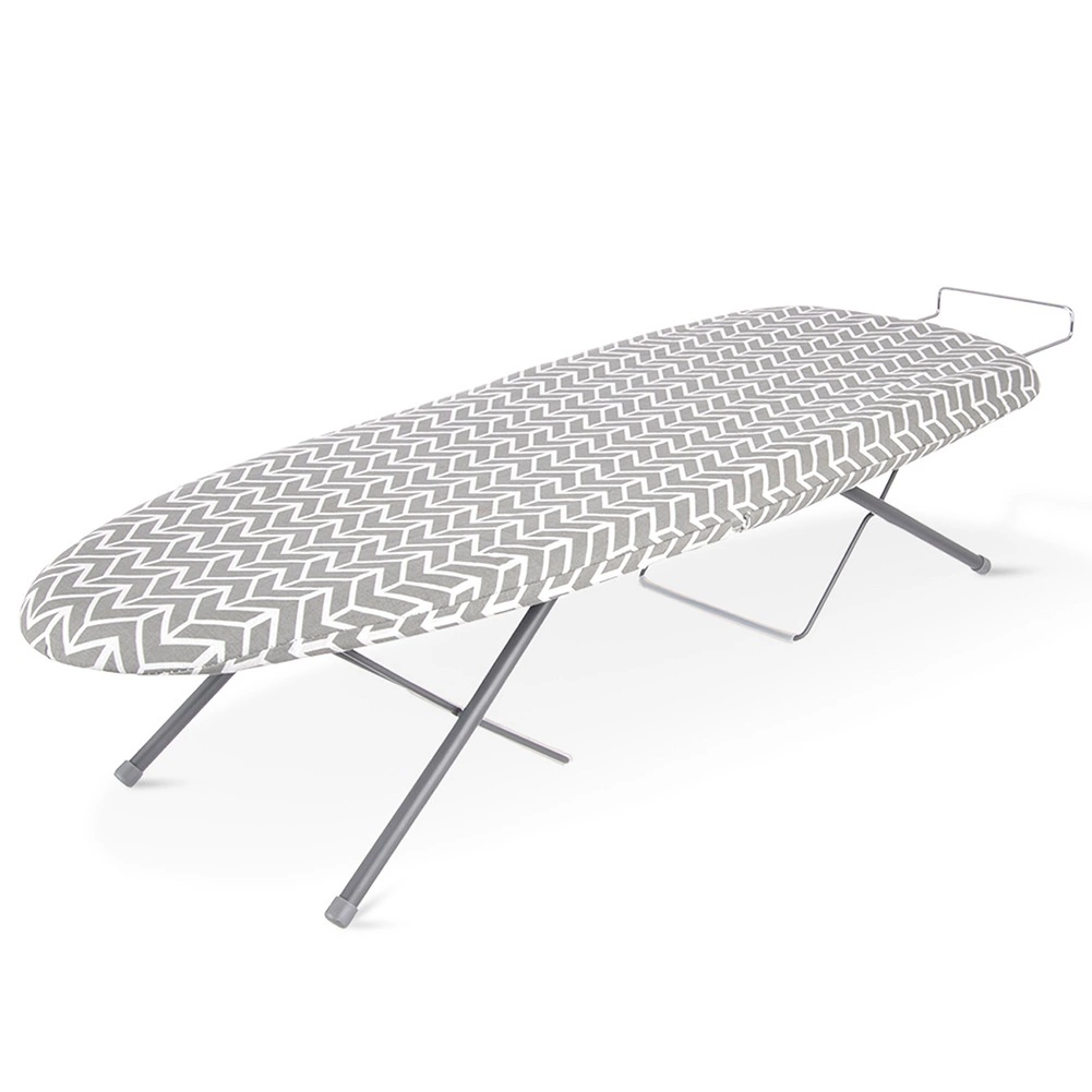 Compacte tafelstrijkplank voor kleine appartementen, studentenkamers en reizen met een stabiele metalen constructie, antislipvoetjes en een comfortabele katoenen hoes met viltvulling. Voorzien van een uitschuifbare houder voor het strijkijzer, eenvoudig uit te klappen en neemt opgevouwen minimaal ruimte in.