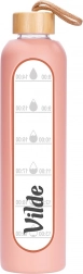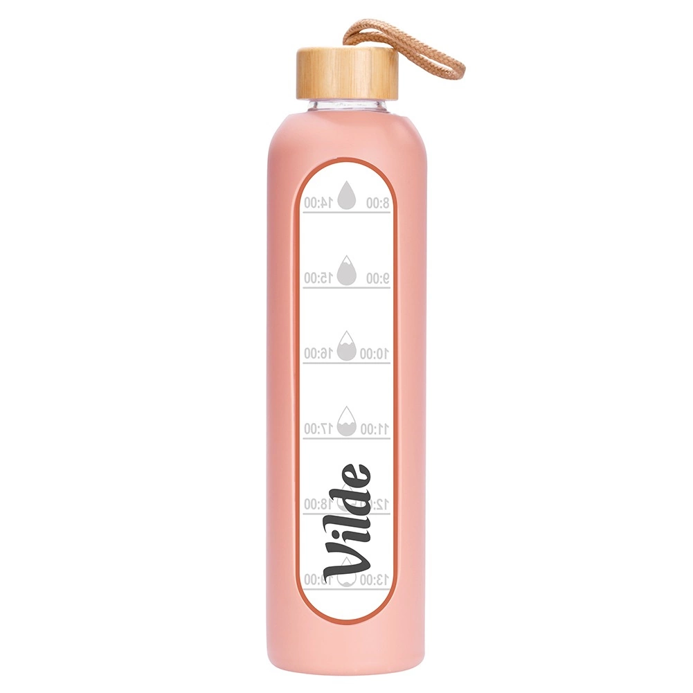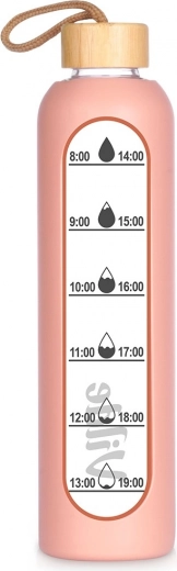 Blijf gehydrateerd in stijl. Deze zalmroze fles combineert elegant design met functionaliteit: duurzaam borosilicaatglas, een veilige bamboe dop met textiell lus en een siliconen hoes voor een zekere grip en bescherming tegen breuk. Dankzij de tijdmarkeringen volg je je waterinname eenvoudig de hele dag door.
