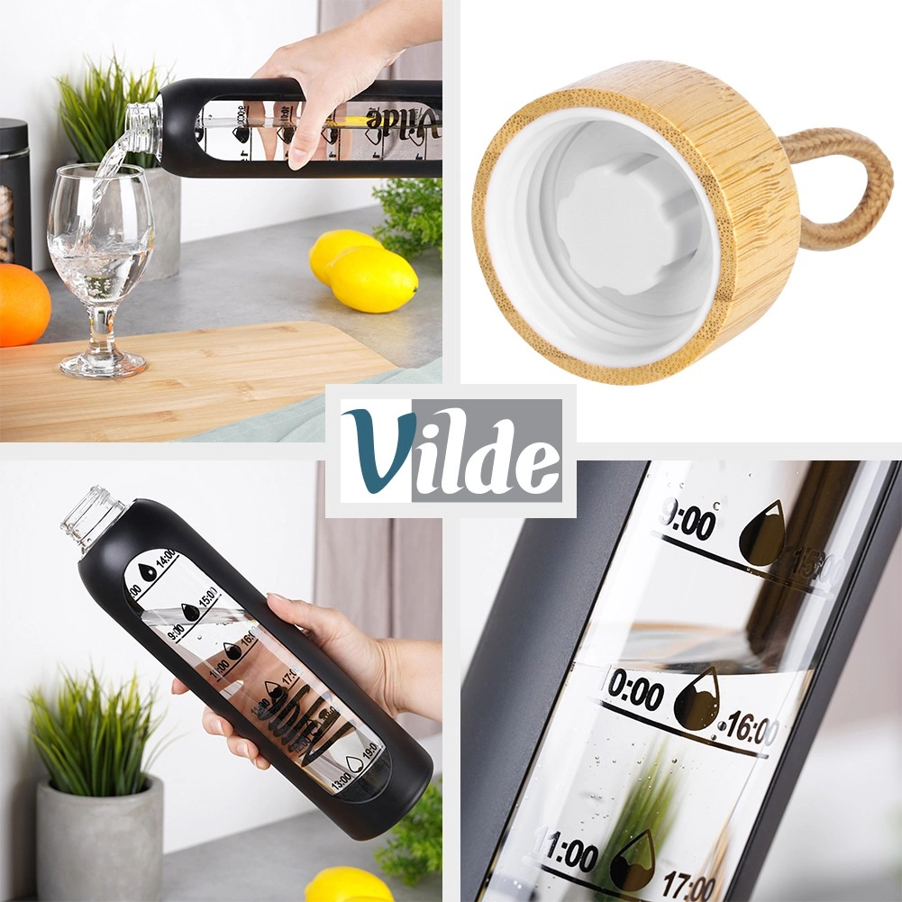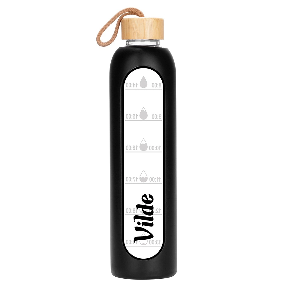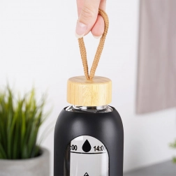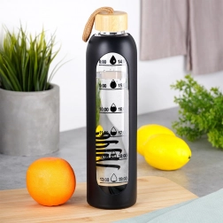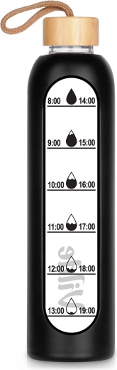 Blijf stijlvol gehydrateerd, ook onderweg. Deze elegante glazen fles van 1 l met zwarte siliconen hoes en bamboe schroefdop is ideaal voor water, huisgemaakte limonades, sappen, smoothies en cocktails. De tijdsmarkeringen van ’s ochtends tot ’s avonds begeleiden je subtiel naar regelmatig drinken.