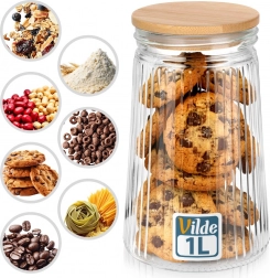Stijlvolle glazen pot van 1 l met bamboe deksel en siliconen afdichting houdt je etenswaren langer vers. Dankzij het transparante, geribbelde glas heb je altijd zicht op de inhoud en oogt de keuken verzorgd en elegant. Ideaal voor koffie, koekjes, pasta, muesli of andere droge voedingsmiddelen. Bestendig borosilicaatglas en een luchtdichte afsluiting garanderen versheid en aroma.