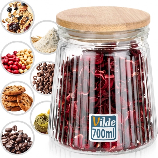 Houd orde in de keuken met deze praktische en mooie pot van borosilicaatglas. Het geribbelde, heldere design accentueert de kleuren van koffie, thee, pasta of noten, terwijl het bamboe deksel met siliconen ring zorgt voor een betrouwbare luchtdichtheid en bescherming tegen vocht.