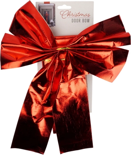 Elegante decoratieve deurstrik met afmetingen 33 × 42 cm en een lange lint van 4,3 m die uw voordeur verandert in een feestelijke blikvanger. Gemaakt van glanzend rood polyester voor een luxueuze uitstraling en vormvastheid. Snel te installeren met klittenband zonder gereedschap en meermalig te gebruiken voor vele seizoenen.