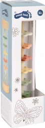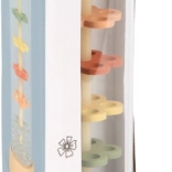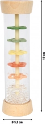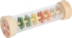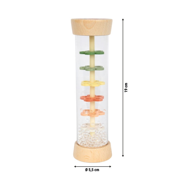 De regenstok Kleine vrienden brengt de magie van vallende druppels rechtstreeks in kinderhanden. Glinsterende kraaltjes vallen langzaam door kleurrijke bloemenschijfjes in de transparante buis en zorgen voor een egale, ontspannende klank. Ideaal voor rustmomenten, voor de eerste ritmische experimenten en als kleurrijke rammelaar.