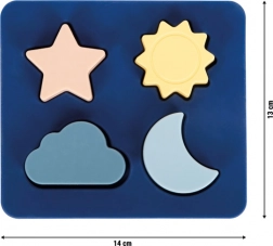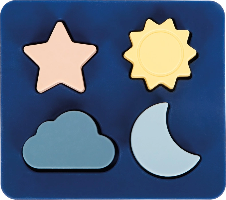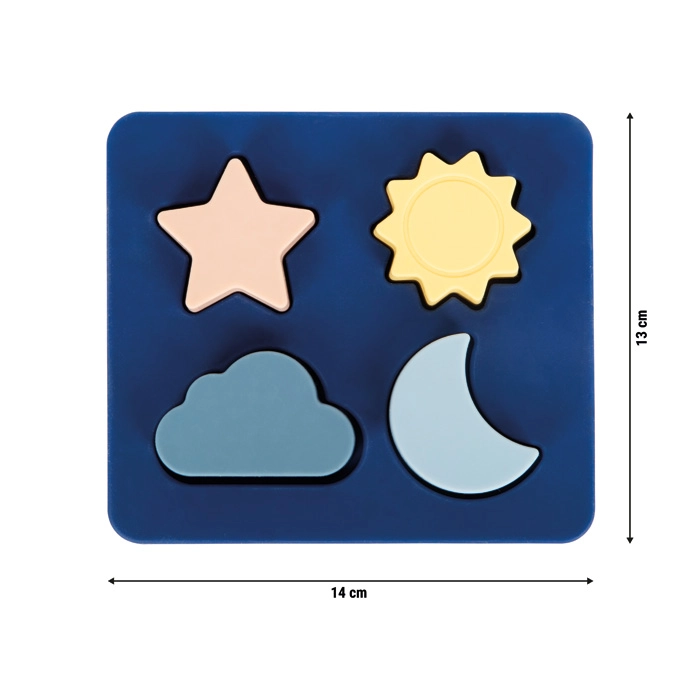 Schattige kinderpuzzel van 100% BPA-vrije, food-grade siliconen voor veilig en leuk leren voor de allerkleinsten. Bevat 4 stukjes in de vorm van een zon, maan, ster en wolkje die van verschillende kanten kunnen worden ingelegd. Het speelgoed is zacht, onbreekbaar, niet-toxisch, makkelijk schoon te maken en ideaal om mee te spelen thuis, in het water en in het zand – perfect voor onderweg en voor de ontwikkeling van de fijne motoriek en zintuiglijke waarneming.