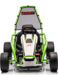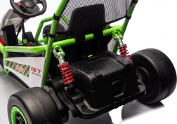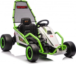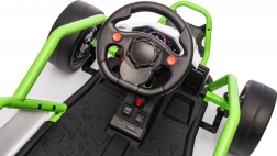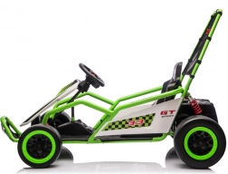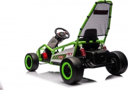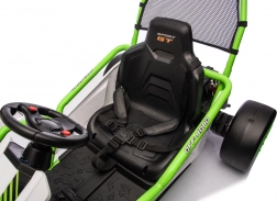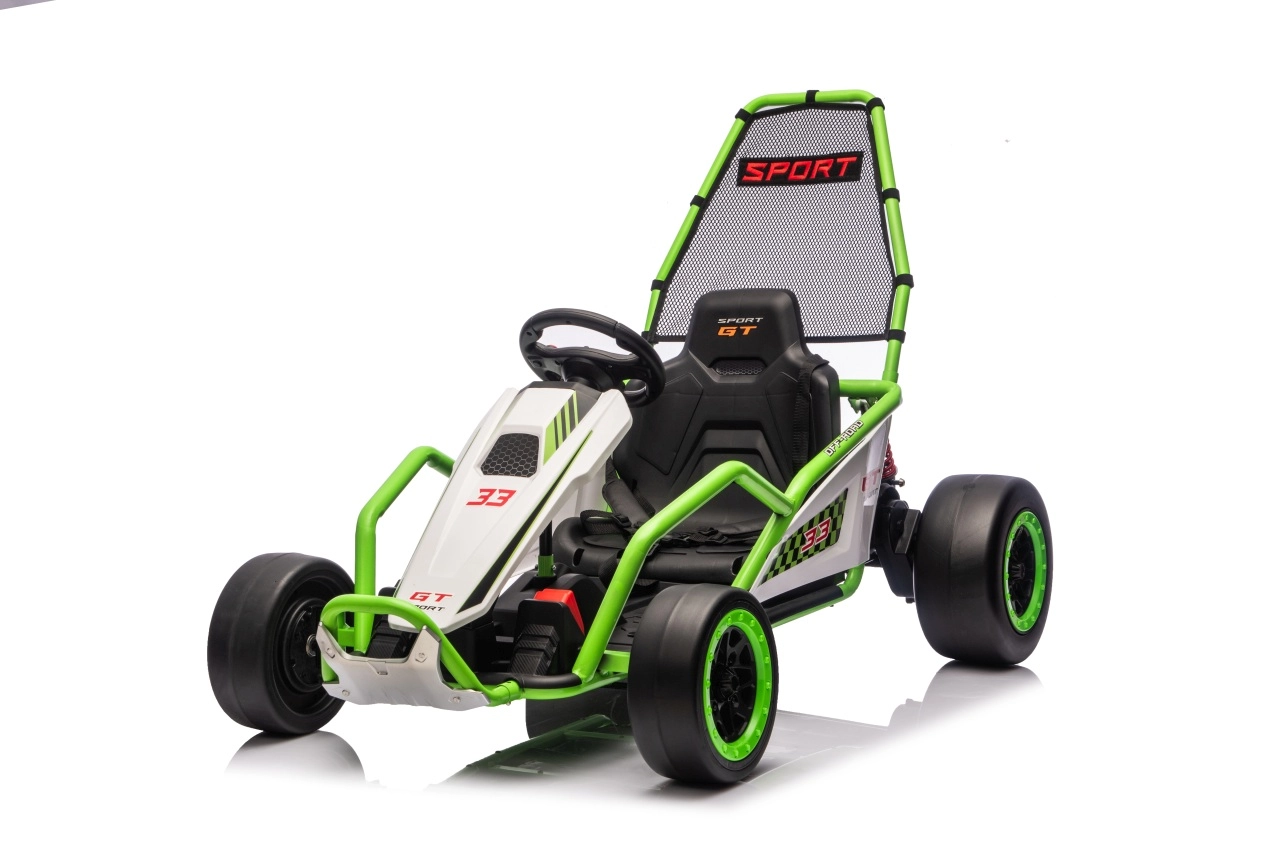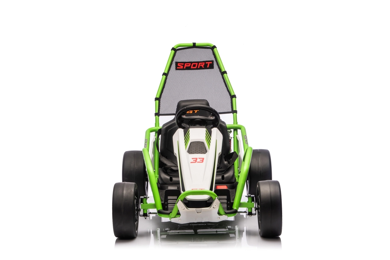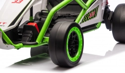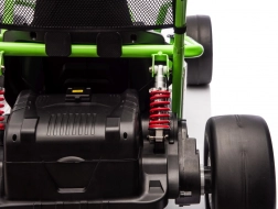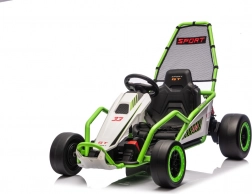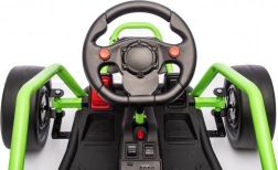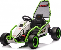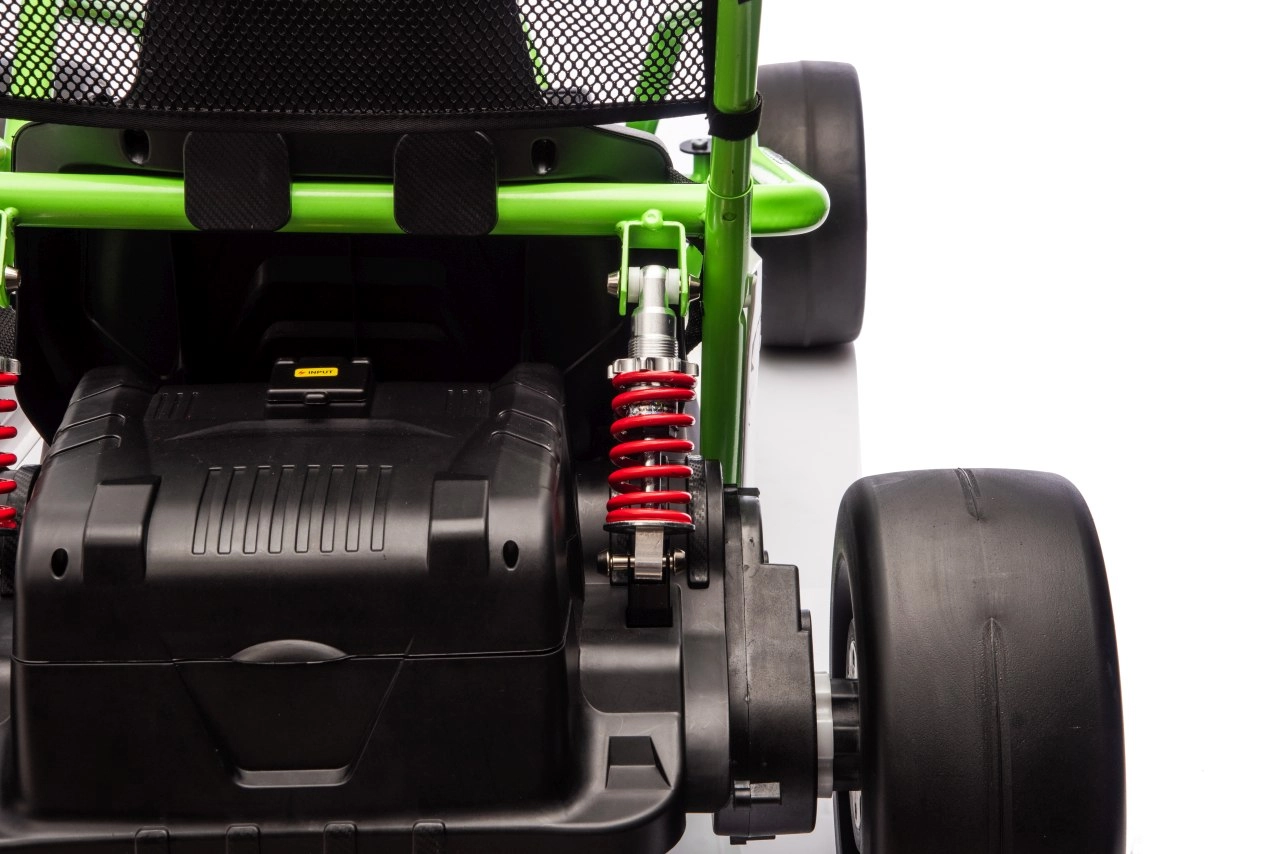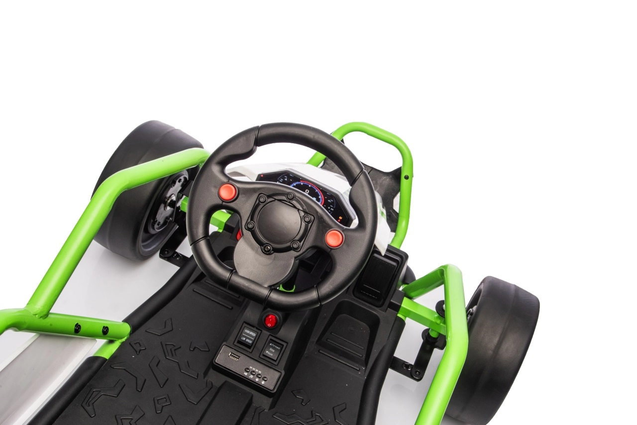 Leuke kinderkart met elektrische aandrijving 24 V en twee motoren 2×150 W biedt een adembenemende rit met driftfunctie. Voorste EVA-wielen voor stille en comfortabele rit, achterste kunststof wielen voor gecontroleerde drifts, verstelbare achterdempers, twee snelheden en een multimediapaneel met MP3/USB/Bluetooth. Robuust frame, sportstoel met veiligheidsgordels en draagvermogen 50 kg zorgen voor veilige fun binnen en buiten.