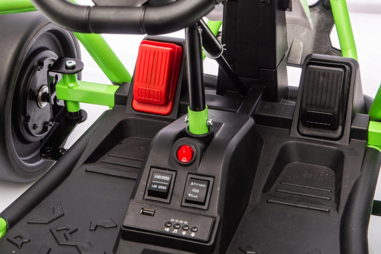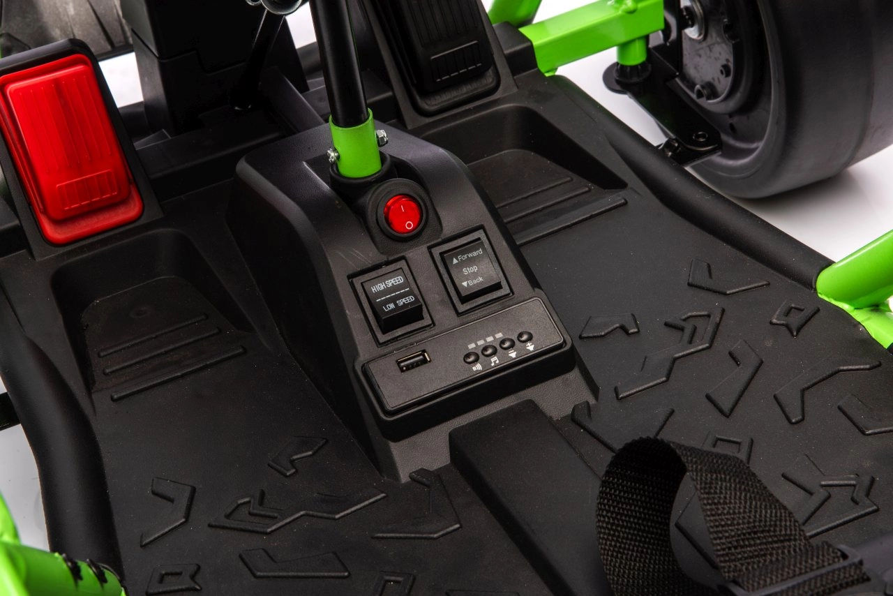 Comfort en veiligheid worden ondersteund door verstelbare achterdempers, een sportstoel met veiligheidsgordels en een slim cockpit met langzame start voor een rustige wegrit. Het multimediapaneel voegt MP3, USB en Bluetooth-connectiviteit toe; ingebouwde melodieën, claxon en laadstatus-indicator ontbreken niet. De robuuste constructie met hoge bodemvrijheid van 12 cm en een draagvermogen van 50 kg is klaar voor dagelijks rijden.