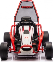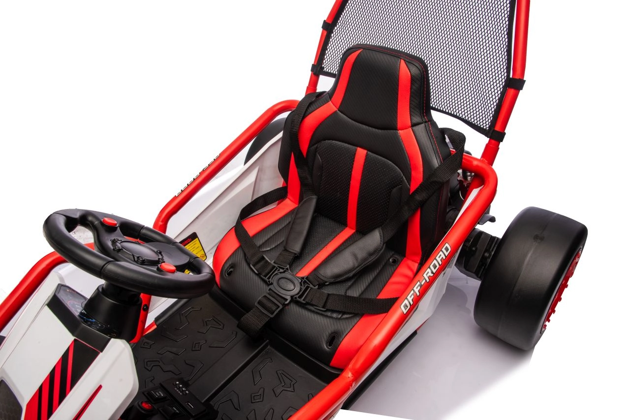 De robuuste constructie met dubbele achterste verstelbare schokdempers verhoogt het comfort en de controle op vlakke ondergrond. De rijke uitrusting omvat een audiopaneel met MP3, USB en Bluetooth, ingebouwde melodieën, claxon en een batterijniveau-indicator. De sportstoel met gordels houdt de bestuurder stevig op zijn plek.