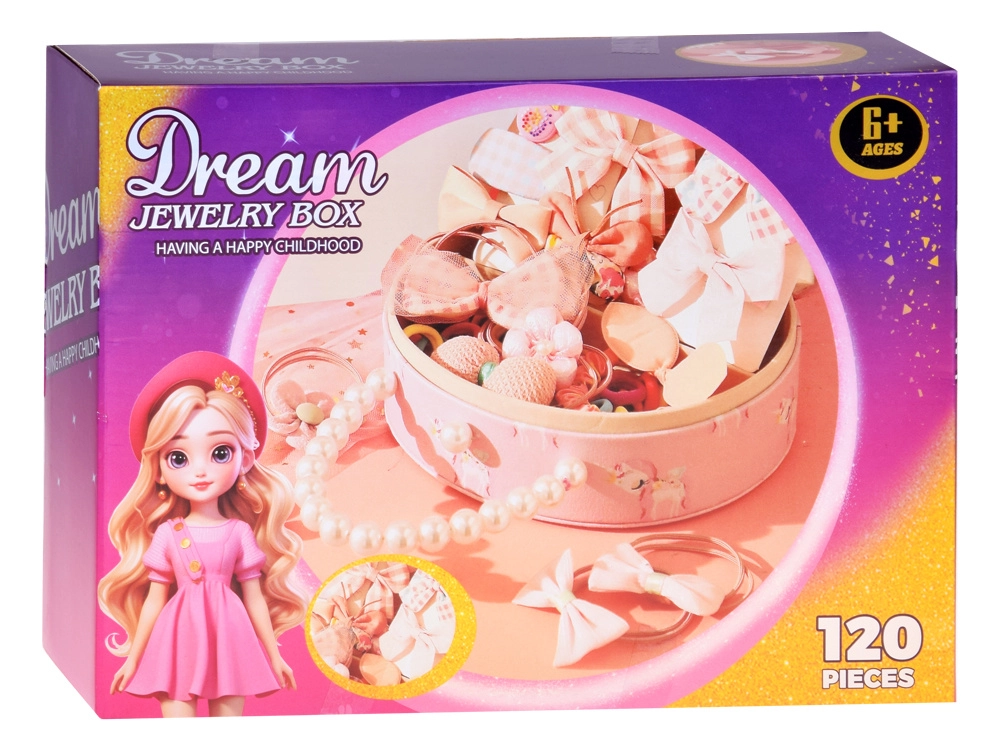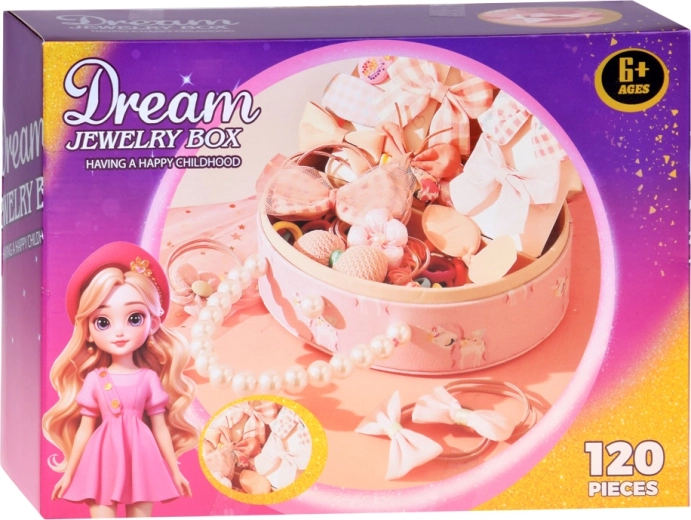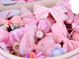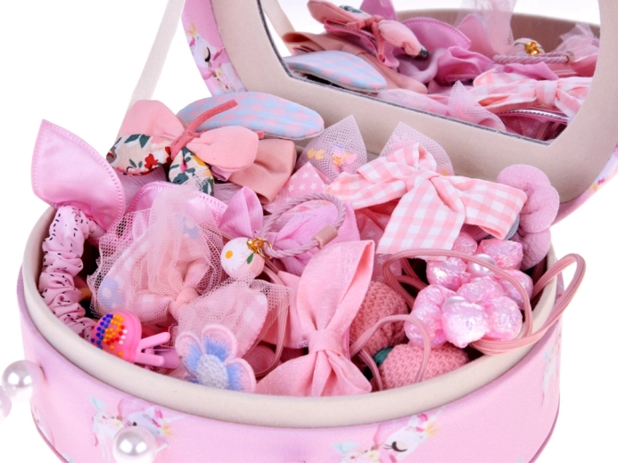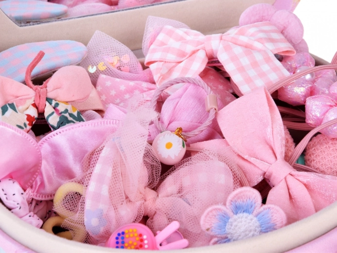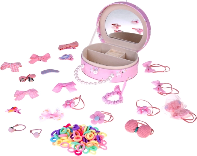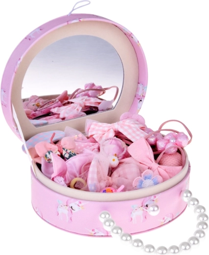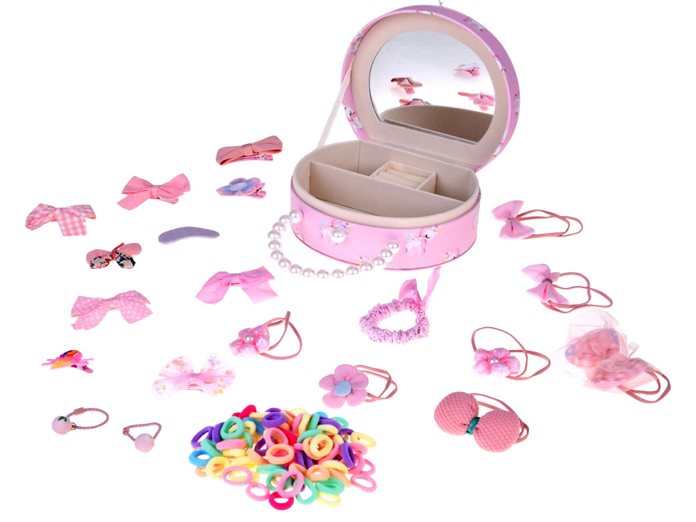 De uitgebreide set accessoires stimuleert creatief kammen en trendy haarstyling. Je vindt er 10 verschillende clipjes (strikjes, vlinder, bloemetjes, ovaal), 10 decoratieve elastiekjes (met bloem, strik, pompon of oortjes) en ongeveer 100 mini elastiekjes in vrolijke kleuren. Ook een parelketting ontbreekt niet om de outfit compleet te maken.