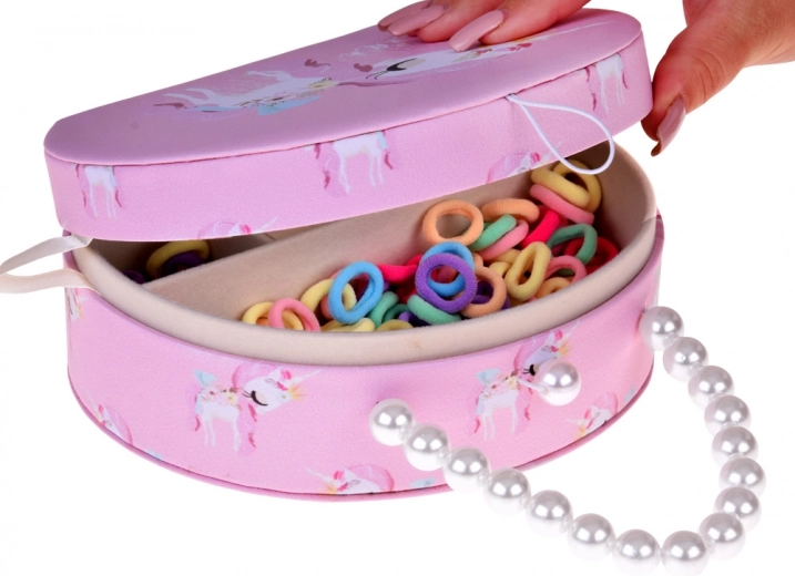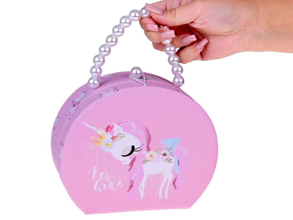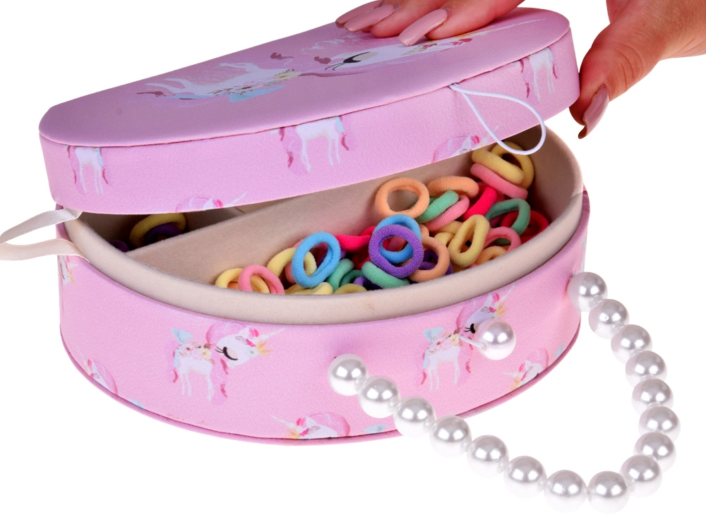 Elegant ovaal sieradendoosje van eco-leer in een zachte roze kleur, versierd met een eenhoorn. Ideaal voor het opbergen van kinderlijke sieraden en haaraccessoires. Binnenin bevindt zich een geïntegreerd spiegeltje, zachte bekleding en 3 vakken (2 kleine en 1 grote), inclusief ruimte voor ringetjes. Het parelhandvat maakt meenemen naar bezoekjes of logeerpartijtjes eenvoudig.