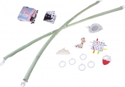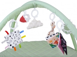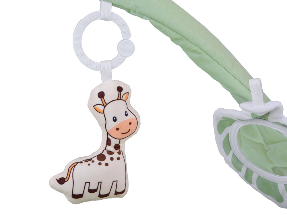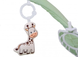 Twee flexibele bogen zijn eenvoudig los te maken voor het wassen of reizen. De opgehangen speeltjes – bijtring, wolkje, giraffe en knisperende vierkantjes – motiveren om te reiken en stimuleren de zintuigen.