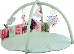 Inclusief een uitgebreide set accessoires: een pluche giraffe, een zacht wolkje, een bijtring, een veilig spiegeltje, een knisperend vierkant met labeltjes en contrasterende stoffen boekjes. Zo “groeit” de mat met het kind mee – van kijken boven het hoofd, via tummy time, tot de eerste omrolpogingen en zitten.