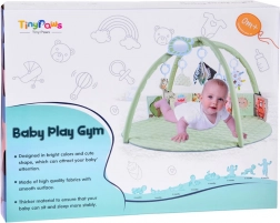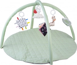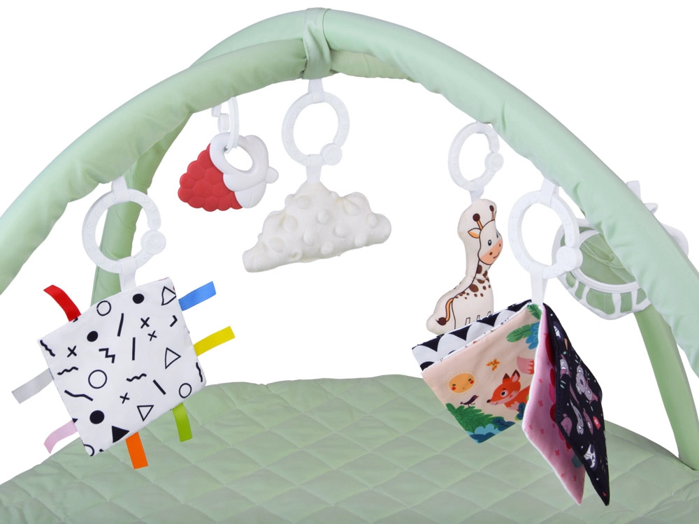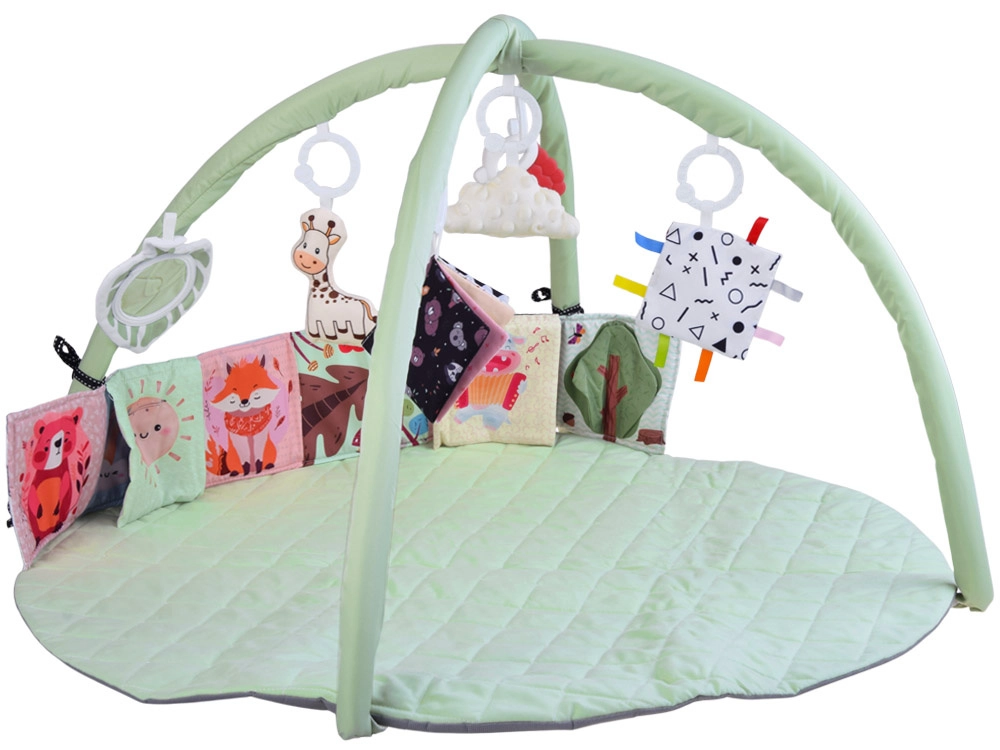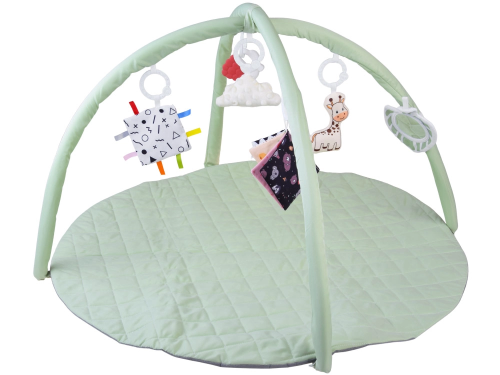Deze ronde, zacht gewatteerde speelmat in pastel mint creëert een veilige en comfortabele plek voor dagelijks ontdekken. Twee flexibele bogen met eenvoudig losklikken maken snelle verzorging en compact opvouwen voor onderweg mogelijk. Diverse texturen, knisperende elementen en contrasterende patronen stimuleren op natuurlijke wijze zicht, gehoor en tast, terwijl de hangspeeltjes motiveren om te reiken, te trappelen en om te rollen.