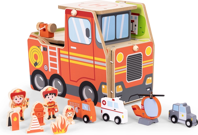 De doordachte opvouwbare 2-in-1 constructie laat kinderen spelen in een ruime kazerne die je na afloop eenvoudig sluit tot een brandweerwagen – ideaal om op te bergen en mee te nemen. De kazerne met twee verdiepingen, garage, helihaven en thematische details nodigt uit tot realistisch rollenspel als hulpverlener.